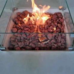 - Includes 3kg of Lava Rock fuel, a PVC firepit cover and a Glass Wind Shield