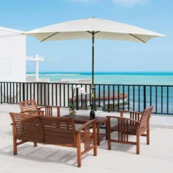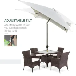 Stay cool and protected from the sun with the Outsunny Tilting Parasol. This rectangular umbrella is designed to provide a shaded and comfortable space in your garden or patio. The polyester canopy filters UV rays, reducing the risk of sun damage and sunstroke. With its practical design, this parasol features a crank handle for easy opening and closing, as well as a button for quick and easy canopy adjustment. The lightweight and foldable construction make it convenient to use, and the tilting feature allows you to find the perfect angle for better protection. Please note that the base is not included.