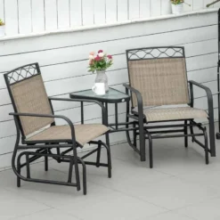 If you are looking for a modern design piece of furniture to complement your outdoor living space, this Outsunny rocking garden chair set is the one for you. Constructed from a strong metal powder coated frame, this garden bench will last for years to come. Covered in a texeline material, it will be protected from the elements by draining water and will circulate air to keep you cool on warm summer days. The gliding arms will gently rock you back and forth keeping you completely relaxed for hours on end. With a deep seat, high back and curved arm rest, this garden chair will keep you supported and comfortable all day long. Featuring a beautiful cut out weave design along the top edge of the seats this garden chair set is elegant and will certainly be a talking point amongst you and your company. Complete with a tempered glass central table perfect for you and a friend to rest your drink or book.