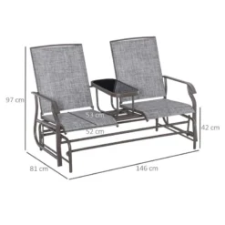 Check out this Outsunny double garden seat with centre table perfect for resting your drink or book on. Constructed from a metal frame this garden bench is durable and the powder coating protects the garden chairs from the weather elements for years to come. The seat and back rest are covered in a mesh fabric, this allowed air the circulate keeping you all on cool on warm summer days and can be easily cleaned with a damp cloth. The deep seat, high back and curved arm rests offers you and a friend ultimate support and comfort for hours on end. The rocker bench gently glides you back and forth to keep you both totally relaxed in the comfort of your own garden. If you are looking for a modern piece of furniture to complement your garden space, look no further, this is the bench for you.