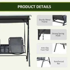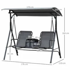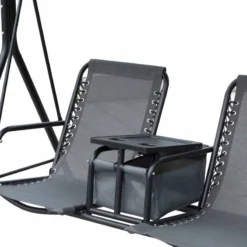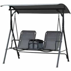 This double-seat Outsunny swing chair is a great way to relax with your partner and enjoy the outdoors. A table in the middle with a storage compartment holds your food and drinks, letting you enjoy the outdoors for long hours. Breathable sling mesh fabric allows the skin to breathe and is also easy to clean. An adjustable canopy gives you protection from direct sunlight and mild rain. Powder-coated steel frame offers extra strength and durability.