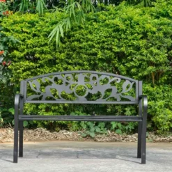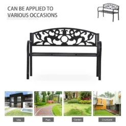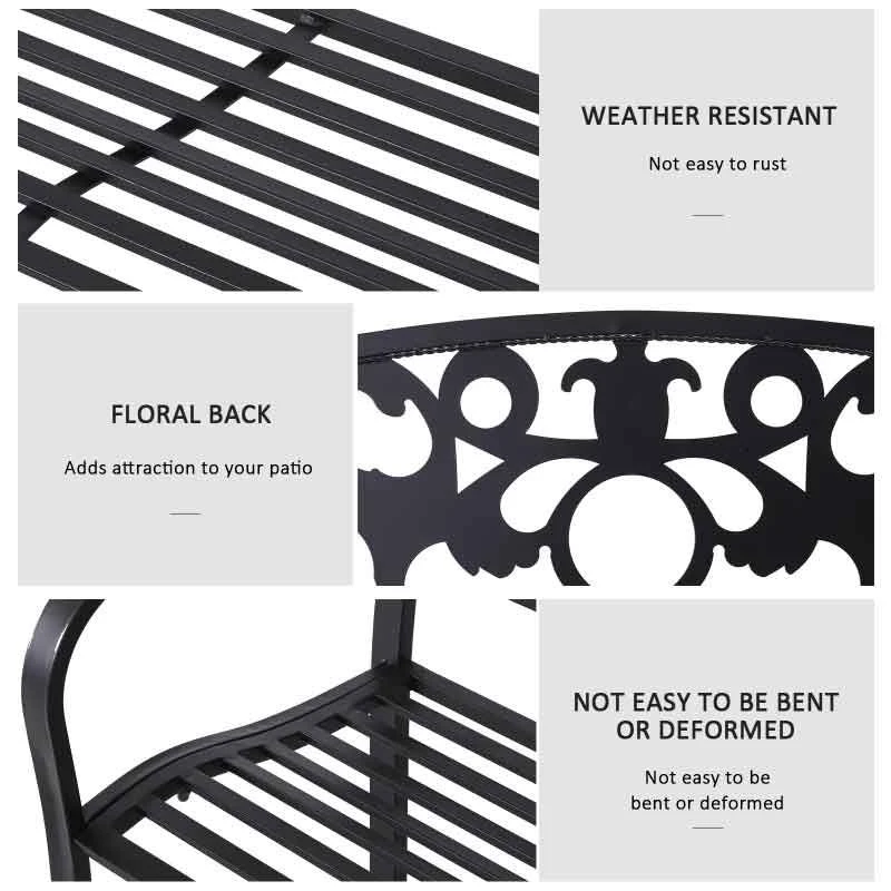 Relax and enjoy your outdoor living space in peace with this Outsunny garden bench. The floral scroll design is crafted beautifully and will finish of your garden perfectly. Constructed from a high-quality powder coated metal this bench is designed to withstand the outdoor elements from years to come. The high back and curved slatted seat and arm rests will ensure you are always supported and comfortable. Designed to prevent water build up, this bench is durable against rusting and peeling.