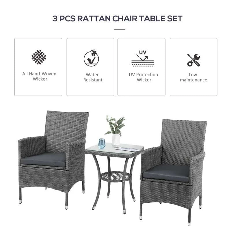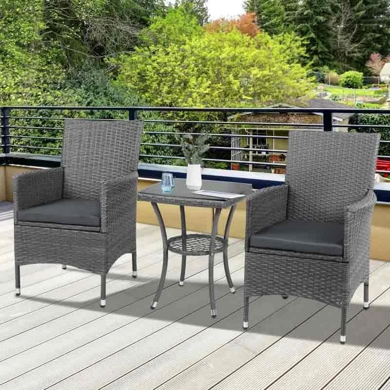 Outsunny’s outdoor bistro set would look amazing on any patio, garden, porch, or other outdoor location. The rattan bistro set’s frames are composed of powder-coated steel for a sturdy construction and are covered in plastic wicker for a garden rattan look. A matching table with a safe and stylish glass top provides a handy side surface. Use throughout each season. The set is water and UV-resistant. A table with two-tier for additional storage. Assembly is necessary.