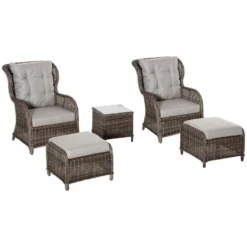 - Five-piece set formed of two outdoor armchairs, two footstools and a matching coffee table