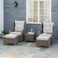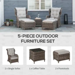 Check out this Outsunny 5-piece rattan garden furniture set with 2 armchairs, 2 foot stools and a small side table that we can be sure will compliment your outdoor living space perfectly. The design mean you can arrange into a position of your liking and tuck the furniture set into a nice corner of your garden making the most out of your space. Constructed from a metal frame and covered in a PE rattan wicker, this garden furniture set is durable, strong and will last for years to come. The extra wide seats, high backs and armrests will keep you and a friend supported and completely comfortable for hours on end. The thick cushions, each have a zip making them easy to remove to wash and maintain yourself at home. The coffee table is light weight so is easily manoeuvred to your preferred position, ideal for resting your drinks and snack bowls and finished off with an elegant glass top. Sit back and relax with your feet up on the foot stools or use as additional seating to entertain a few others. If you are looking for a stylish and unique design rattan garden furniture set, this is the one for you.
