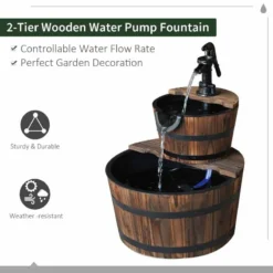 Enhance the beauty of your garden with the charming Outsunny outdoor 2 tier wooden water feature. Crafted from durable fir wood and designed in the shape of barrels, this fountain adds a rustic and elegant touch to your outdoor living space. The two-tier design features cascading waterfalls that flow from the pump into the barrels, creating a soothing and tranquil atmosphere for you to enjoy in your garden. With a rotate speed of 3600r/min, the water pump ensures a steady flow of water, while the switch allows you to control the water volume. Made with high-quality materials and CE certification, this water feature is built to last. Assembly is easy, and the fountain comes with a British standard plug for convenient use.