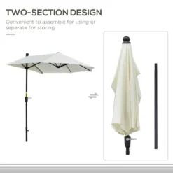 The Outsunny half parasol features an exclusive half-cut size that allows it to stand against your wall and provide safe and dependable shade. This parasol produces an enjoyable shaded space when placed against a wall, window, or fence. The extra-long canopy provides larger shade coverage than normal umbrellas, keeping you safe while you enjoy the sun. Opening and closing the canopy is easy with the handy crank handle. The heavy-duty steel frame and rib connectors offer strength and longevity. It comes with a cross base for added stability, but weights are not included. For increased stability, recommend ordering Outsunny weighted plates (ASIN B00BJBV55I, SKU 01-0221). Assembly is necessary.