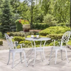 This 3-piece outdoor garden table set from Outsunny is a hollow-carved design and stylish, also help quick drying after rain. This garden table set has simple and modern appearance, Ideal for backyards, balconies, roadsides, and breakfast corners.