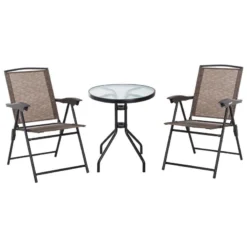 Outsunny 3 Pieces Bistro set includes Tempered glass tabletop and chairs with adjustable backrests. Steel frame construction guarantees the material’s strength and longevity. The garden chairs are easily transportable and foldable so they can be stored away to conserve room. The Sling fabric seats with curved arms offer the best level of comfort. An excellent addition for your deck, patio, garden, swimming pool, and more. Assembly is necessary.