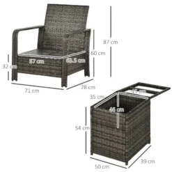 This outdoor furniture collection from Outsunny with two spacious armchairs and a matching table is perfect for enjoying lazy afternoons in the sun. For this summer season, the three-piece set is ideal for unwinding and catching up with a buddy outdoors. Each piece has a steel base structure that is covered in PE rattan to ensure strength and protection from weather conditions while making it simple to clean. A discrete storage space for organisation on the table is available.