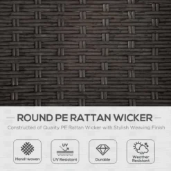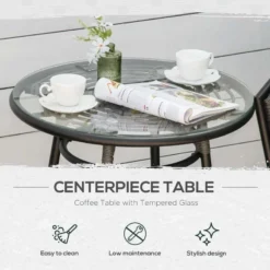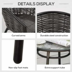 The 3-piece patio resin wicker bistro set from Outsunny is a good choice for your interior and outdoor spaces. A round coffee table and two ergonomically designed seats are included in the set. This outdoor furniture enhances your home and is made of sturdy PE rattan and steel frames. The tabletop’s tempered glass can be easily cleaned with a damp cloth. This patio set is robustly constructed to resist most weather conditions. The 3-piece garden furniture sets have an elegant appearance for extra comfort and are ideal for spending a relaxing afternoon in the garden or near the poolside. Assembly required.