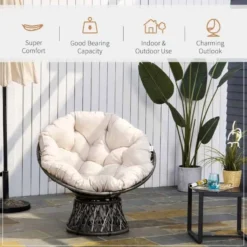 Relax and enjoy the brighter days with this 360-degree swivel Outsunny garden chair. The modern round design adds a stylish feature to your outdoor area. 360° swivel allows you to turn around to your favourite side easily. The large plush cushion offers hours of comfort with its secured tie fastenings keeping the cushion securely in place. Crafted out from PE rattan, the base is weather-resistant and low maintenance. Powder-coated steel frame underneath adds extra support. The chair is also light in weight allowing it to be moved to your favourite corner.