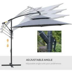 The Outsunny cantilever parasol with lights is the best way to extend the evenings this season. It has a big overhanging parasol and a traditional Cantilever shape, providing enough shade to keep guests safe. Solar-powered LED lights are installed beneath the canopy to brighten the outdoor space at night. The canopy can be opened using the crank handle and adjusted to the desired position. Outsunny weights are needed to finish the cross base. Strong metal structure with eight ribs connecting to the canopy for extra stability. Two-tier canopy to keep built-up air to a minimum. Cross-base included weights needed for extra stability. Assembly required.