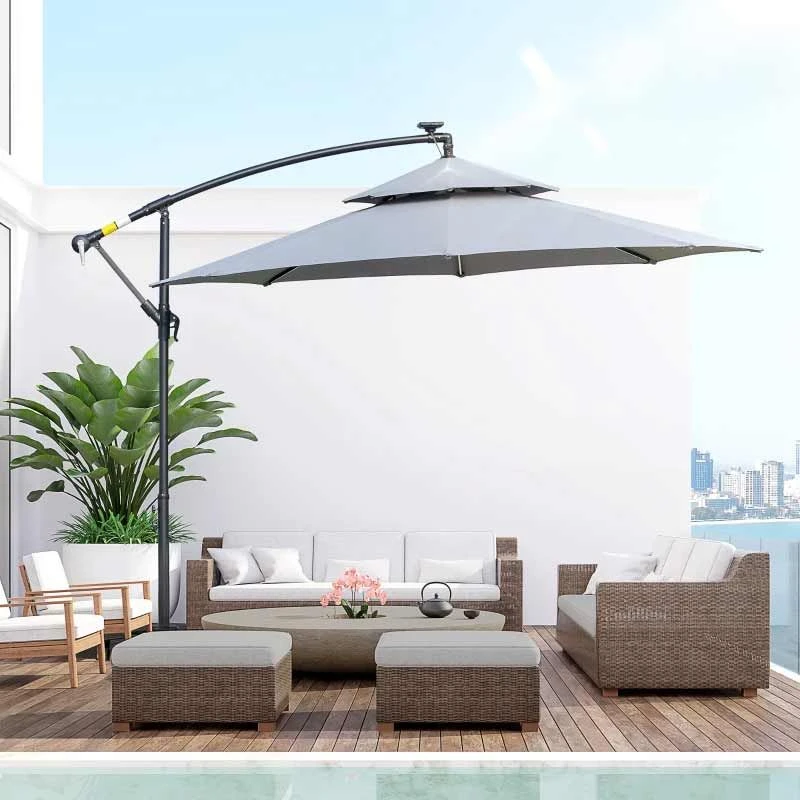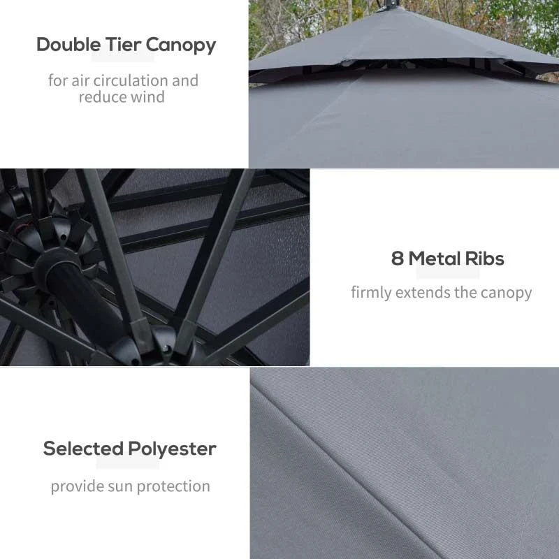 Outsunny 3m Cantilever Banana Parasol Hanging Umbrella with LED Solar lights, Crank, 8 Sturdy Ribs and Cross Base – Grey – 84D-180GY
