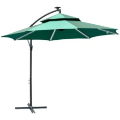 Outsunny 3m Cantilever Banana Parasol with LED Solar lights, Crank, 8 Sturdy Ribs and Cross Base – Green – 84D-180GN