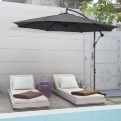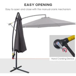 Outsunny garden parasols are ideal for relaxing in the garden, patio, backyard, beach, pool, or other outdoor space this summer. The Banana umbrella is UV and fade-resistant. Cantilever Parasol is made of heavy-duty polyester fabric with rust-free 8 ribs and a powder-coated steel frame for increased strength. The crank-lifting system makes opening and closing the umbrella easy. The canopy angle can be adjusted to match your needs. Weights are required, and the cross base is included.