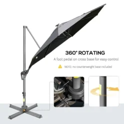 The cantilever parasol with lights is perfect for the garden and sitting beneath the stars at night to enjoy evenings. The enormous canopy provides shade for a large area, and they are solar-powered lights with no need for electricity or wiring. The crank handle on the LED parasol makes it simple to use. The LED parasol is made of an aluminium frame and is long-lasting, with eight ribs to support the canopy. The canopy rotates 360 degrees and adjusts to four different positions to cover and protect you all day. The cross base is included; weights are not. Do not leave in bad weather.