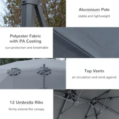 With the Outsunny double-size canopy parasol, you can make the best use of your outside space. Its adjustable angle feature allows for easy adjustment to four distinct angles, ensuring effective coverage all day. can increase the shaded area by using the 360° rotation capabilities, which can be operated by a foot pedal. The parasol comes with a cross base to ensure stability; additional weights are advised. Assembly is required, and it is best to avoid leaving the parasol exposed to bad weather.