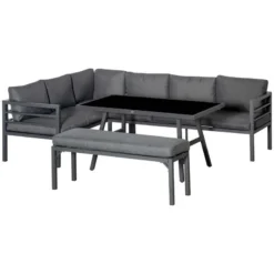 Check out this Outsunny 4pcs garden furniture set, complete with L shaped sofa, bench and glass top dining table, perfect for you and your family and friends to enjoy each-others company in the comfort of your own garden. The included cushions on the seat and back rests will keep you supported and comfortable for hours on end and the zipper covers are easily removed to be washed and maintained. The dining table is ideal for resting multiple drinks and snack bowls or to even eat dinner around, it is also lightweight so can be manoeuvred to your preferred position. Constructed from a strong metal frame, this garden set is durable, weather resistant and will last for years to come. The slatted seat design will drain water, extending this garden furniture set lifespan. We can be sure the modern design is ideal for any outdoor living space and will compliment your garden perfectly.
