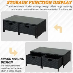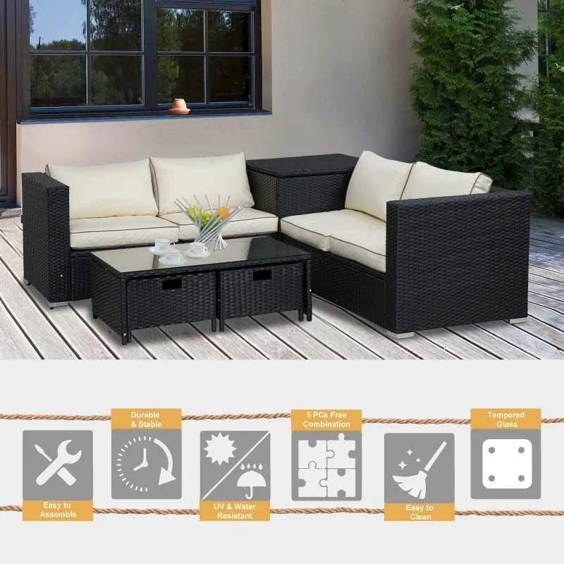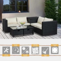 - 4 piece outdoor dining set includes 2 two-seater sofas, a storage table and a coffee table with 2 drawers