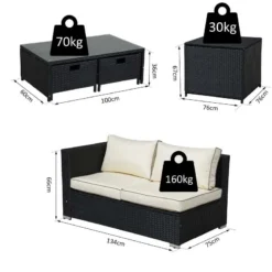 - Weight Capacity: Seat: 160kg/per. Corner Box: 30kg. Coffee table: 70kg