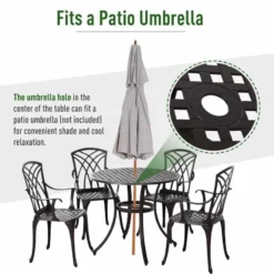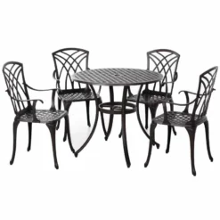 With a compact design, perfect for small outside areas, This five-piece Stamford set from Outsunny consists of four bistro chairs and a matching table, with cast aluminium forming the frame of all three pieces to ensure they are sturdy and tough, as well as being resistant to rusting and mild everyday wear-and-tear. Round in shape, the table features a middle hole to keep a sun parasol securely in place, with the back of the chairs showcasing a cut-out design for an attractive finish whether seated or not. Ideal for flats and apartments with balconies.