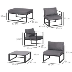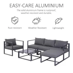 Check out this Outsunny 6-piece metal garden furniture set with an armchair, 1 middle chair, 2 corner chairs and coffee table that we can be sure will compliment your outdoor living space perfectly. The modern design mean you can tuck the furniture set into a nice corner of your garden making the most out of your space. Constructed from a powder coated metal frame, this garden furniture set is durable, strong and will last for years to come. The extra wide seats, high back and arm rests will keep you and a few friends supported and completely comfortable for hours on end. The thick cushions, each have a zip making them easy to remove to wash and maintain yourself at home. The coffee table is light weight so is easily manoeuvred to your preferred position, even with the elegant glass top finish. Sit back and relax with your feet up on the foot stool or use as additional seating to entertain another. If you are looking for a relaxing and modern metal garden furniture set, this is the one for you.