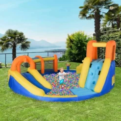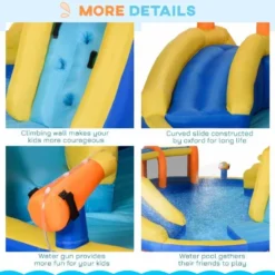 Check out this fun and quirky Outsunny bouncy castle that we can be sure will keep your kids entertained for hours on end. Let the kids jump and slide into the added paddling pool to keep cool on warm summer days or fill with balls to create a ball pit. The slides, climbing wall, tunnel and ball hoop are perfect for all kids to enjoy, big or small. Simply connect your hose pipe to activate the sprayer and water gun and to let the water fights commence. Your kids are safe and secure and will keep you at ease and relaxed, the stakes enable you to safely secure this castle to the ground. Made from an environmentally friendly and water-resistant Oxford fabric that is strong, durable and will last for years to come, in case of a puncture this castle comes will spare patches for you to maintain and repair at home. Inflate in momentβs notice with the supplied high quality electric inflater and compactly store away in the added carry bag when not in use. If you are you looking for a bright and happy place for your kids to play, look no further this bouncy castle is the one for you.