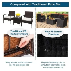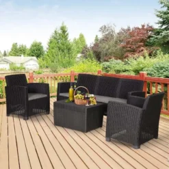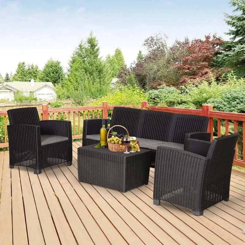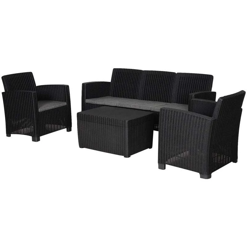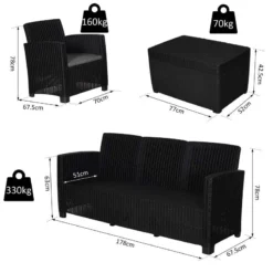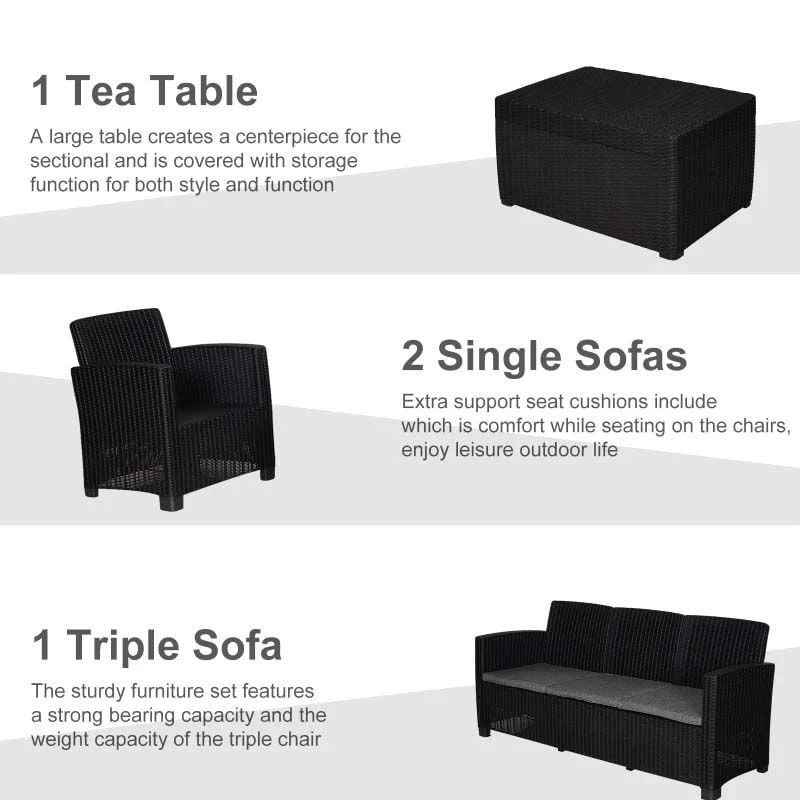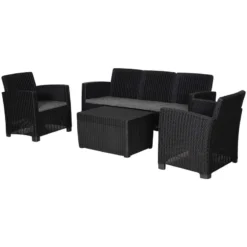 Check out this Outsunny 4-piece rattan effect garden furniture set with 3-seater sofa, 2 arm chairs and coffee table that we can be sure will compliment your outdoor living space perfectly. The design mean you can tuck the furniture set into a nice corner of your garden making the most out of your space. Constructed from PP rattan effect wicker, this garden furniture set is durable, strong and will last for years to come. The extra wide seats, high back and arm rests will keep you and a few friends supported and completely comfortable for hours on end. The thick cushions, each have a zip making them easy to remove to wash and maintain yourself at home. The coffee table is light weight so is easily manoeuvred to your preferred position, what more, lift the tabletop to reveal underneath storage ideal for keeping garden toys, blankets and much more. If you are looking for a relaxing and classic design rattan effect garden furniture set, this is the one for you.