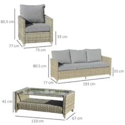Check out this Outsunny 4-piece rattan garden furniture set with 2 armchairs, 3-seater sofa and coffee table that we can be sure will compliment your outdoor living space perfectly. The design mean you can tuck the furniture set into a nice corner of your garden making the most out of your space. Constructed from a metal frame and covered in a PE rattan wicker, this garden furniture set is durable, strong and will last for years to come. The extra wide seats, high back and arm rests will keep you and a few friends supported and completely comfortable for hours on end. The thick cushions, each have a zip making them easy to remove to wash and maintain yourself at home. The coffee table is light weight so is easily manoeuvred to your preferred position, even with the elegant glass top finish, what more, the added under shelf is handy for keeping your phone, books and much more. If you are looking for a relaxing and classic design rattan garden furniture set, this is the one for you.
