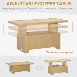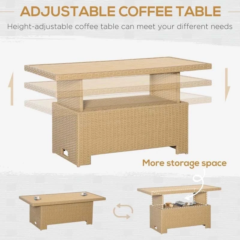 Check out this Outsunny 4-piece rattan garden sofa set with a 3-seater sofa, 2 armchairs and an adjustable dining table that we can be sure will compliment your outdoor living space perfectly. The modern designs mean you can tuck the sofa into a nice corner of your garden making the most out of your space. Constructed from a metal frame and covered in a PE rattan wicker, this garden sofa set is durable, strong and will last for years to come. The extra wide seats, high back and arm rests will keep you and a few friends supported and completely comfortable for hours on end. The thick cushions, each have a zip making them easy to remove to wash and maintain yourself at home. Convert the coffee table into a dining table by lifting up the tabletop to adjust to height, complete with wood effect finish. If you are looking for a relaxing and modern rattan garden sofa set, this is the one for you.