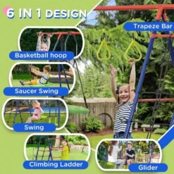 This Outsunny six-in-one swing set for kids provides instant fun space for any backyard, garden, or park. The design comes with a glider, saucer, swing, climbing ladder, trapeze bar, and basketball hoop offering lots of fun to keep kids entertained. The swings are suitable for up to six children at once. The glider is fitted with footrests for comfort. Height-adjustable durable ropes suit users of different ages. The metal frame, made into an βAβ shape provides full support and balance with ground stakes. Powder coating helps prevent rust and excessive heat buildup. This Outsunny swing set is an exciting and safe way to keep kids active, whilst they enjoy themselves.