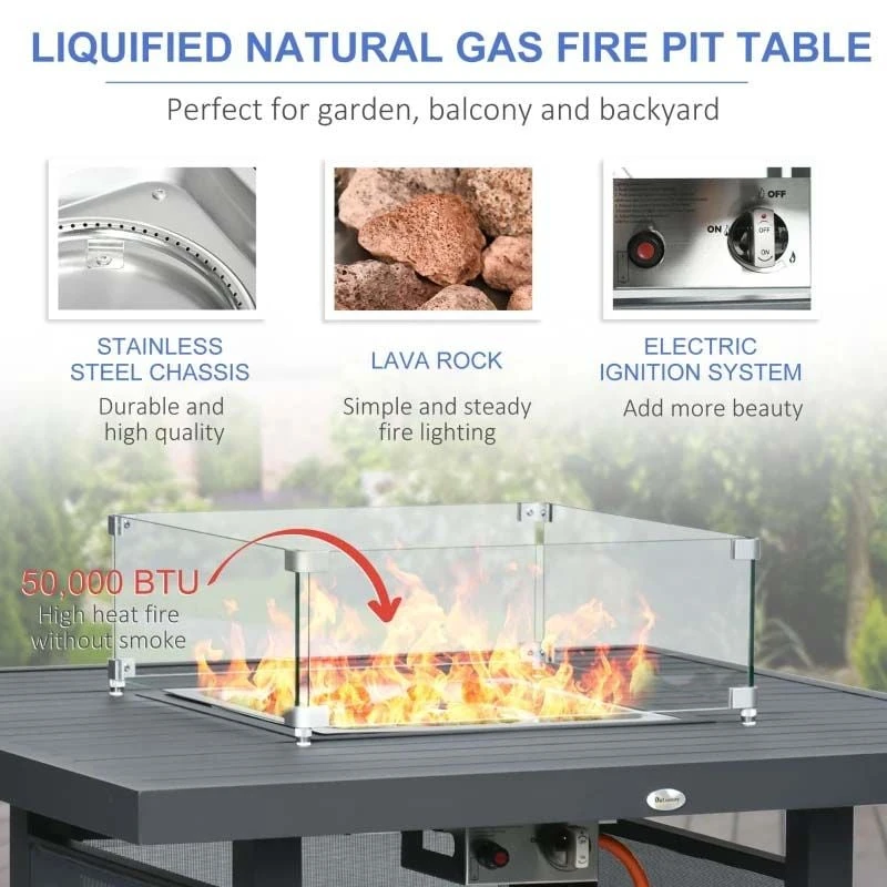 The Outsunny 6 Piece Garden Furniture Set includes a Fire pit table that has up to 50,000 BTU heat output. This works with a 11kg gas tank which is not included in the set. With the glass housing cover, you are protected while sitting around the table and the powder coated aluminium frames are strong and supportive. The set incldues padded cushions which are removable with washable covers.