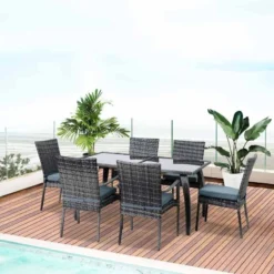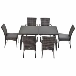 Turn your patio or deck into a casual dining area with this 7 pieces garden dining furniture set from Outsunny. This dining set is fashioned from a beautiful wicker material and reinforced galvanized steel frame. The mildew resistant wicker and detachable cushions of the outdoor dining table and chairs allow for easy cleaning and maintenance. The beautifully designed rattan wicker dining set will bring instant modern charm and elegance to space.