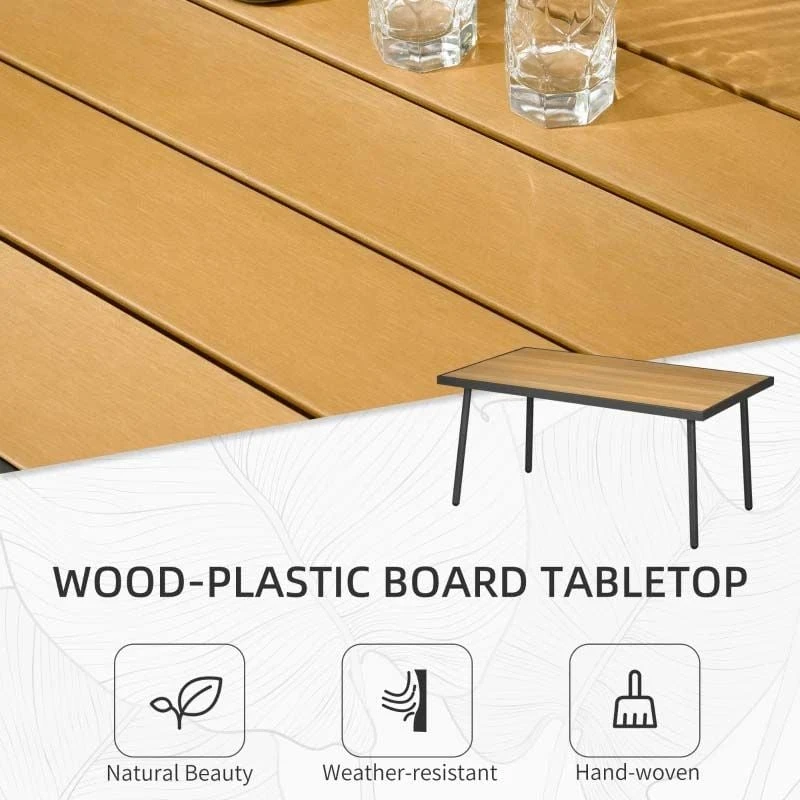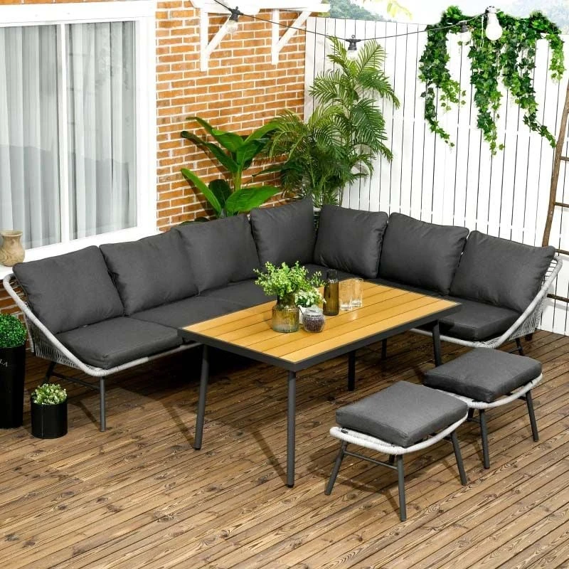 Check out this Outsunny 5-peice rattan wicker garden sofa set with 3 corner sofas, 2 footstools and matching dining table that we can be sure will compliment your outdoor living space perfectly. The modern design mean you can tuck the sofa into a nice corner of your garden making the most out of your space. Constructed from a metal frame and covered in a PE rattan wicker, this garden sofa set is durable, strong and will last for years to come. The extra wide seats, high back and arm rests will keep you and a few friends supported and completely comfortable for hours on end. The thick cushion, each have a zip making them easy to remove to wash and maintain yourself at home. The coffee table is light weight so can be manoeuvred to your preferred position it is also finished off with an elegant wood effect table top. The stylish woven rattan wicker design is beautiful and will look gorgeous in your garden.