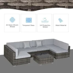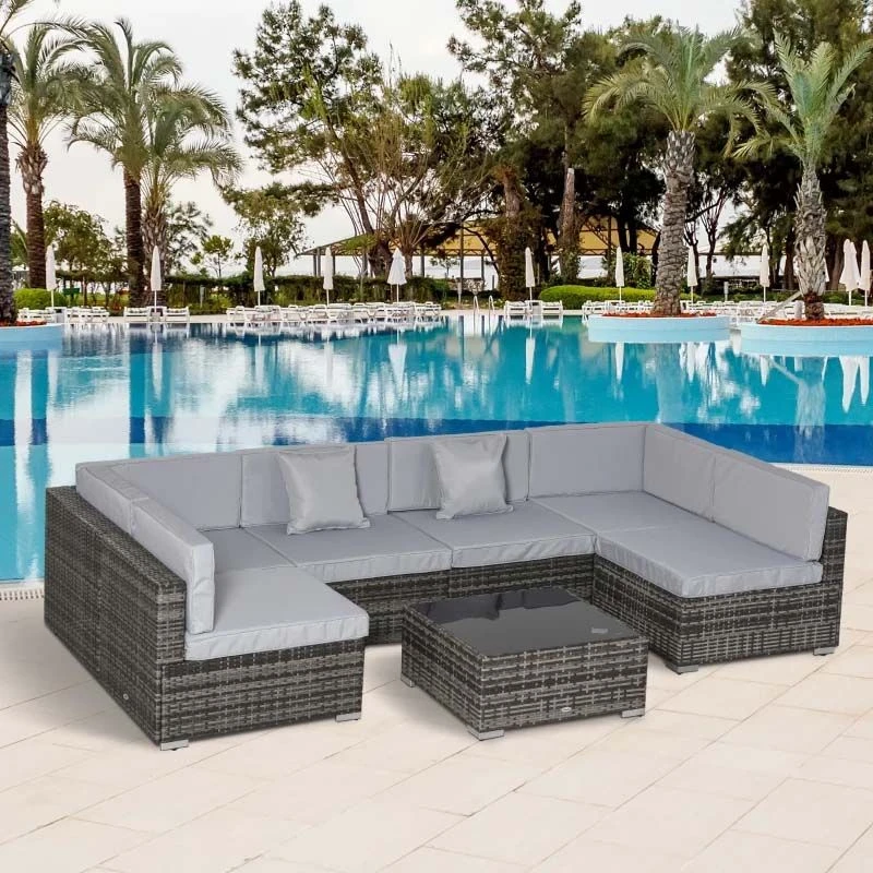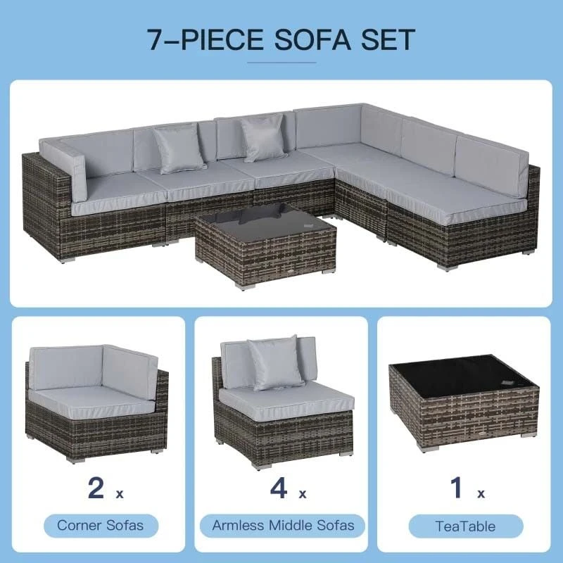 Check out this Outsunny 7-piece rattan garden sofa dining set with 2 corner chairs, 4 middle chairs and a coffee table that we can be sure will compliment your outdoor living space perfectly. The modern design mean you can tuck the sofa into a nice corner of your garden making the most out of your space. Constructed from a metal frame and covered in a PE rattan wicker, this garden sofa set is durable, strong and will last for years to come. The extra wide seats, high back and arm rests will keep you and a few friends supported and completely comfortable for hours on end. The thick cushions, each have a zip making them easy to remove to wash and maintain yourself at home. The coffee table and ideal for resting your drinks or snack bowls and is lightweight so is easily manoeuvred to your preferred position, even with the glass top finish. Keep at a horseshoe shape or sperate the seats and arrange into your preferred positions around your garden. If you are looking for a relaxing and modern rattan garden sofa set, complete with 2 scatter cushions, this is the one for you.