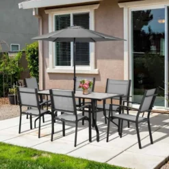 This Outsunny garden dining furniture set will instantly brighten up your garden. This stylish looking set comes with six outdoor chairs and a large dining table. Each chair comes with a mesh panel seat and back for comfort, with high backs and arms for support. The table features a middle hole for a parasol umbrella. This set is made for all season and will surely give you lots of memorable moments.