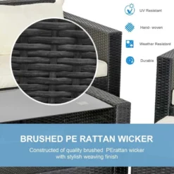 Check out this Outsunny 5-piece rattan garden furniture set with a 3-seater sofa, 2 armchairs, foot stool and coffee table that we can be sure will compliment your outdoor living space perfectly. The design mean you can tuck the furniture set into a nice corner of your garden making the most out of your space. Constructed from a metal frame and covered in a PE rattan wicker, this garden furniture set is durable, strong and will last for years to come. The extra wide seats, high backs and armrests will keep you and a few friends supported and completely comfortable for hours on end. The thick cushions, each have a zip making them easy to remove to wash and maintain yourself at home. The coffee table is light weight so is easily manoeuvred to your preferred position, even with the elegant glass top. Sit back and relax with your feet on the foot stool or use as an additional seat to entertain another. If you are looking for a stylish and unique design rattan garden furniture set, this is the one for you.