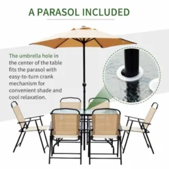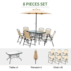 Outsunny 8 Piece Dining Set with 6 Folding Chairs & Umbrella – Beige – 84B191