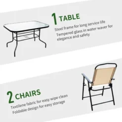 - 1 rectangular table with tempered glass top, 6 folding chairs and 1 round umbrella