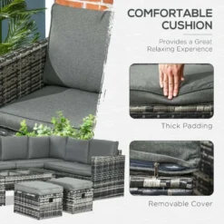 Check out this Outsunny 6-piece rattan garden sofa dining set with 3 single-arm loveseats, 2 foot stools and matching coffee table that we can be sure will compliment your outdoor living space perfectly. The modern design mean you can tuck the sofa into a nice corner of your garden making the most out of your space. Constructed from a metal frame and covered in a PE rattan wicker, this garden sofa set is durable, strong and will last for years to come. The extra wide seats, high back and arm rests will keep you and a few friends supported and completely comfortable for hours on end. The thick cushions, each have a zip making them easy to remove to wash and maintain yourself at home. The coffee table and ideal for resting your drinks or snack bowls and is lightweight so is easily manoeuvred to your preferred position, even with the glass top finish. Sit back and relax with your feet up with the foot stools or use as additional seating to entertain a few others. If you are looking for a relaxing and modern rattan garden sofa set, this is the one for you.