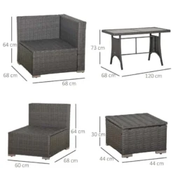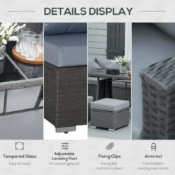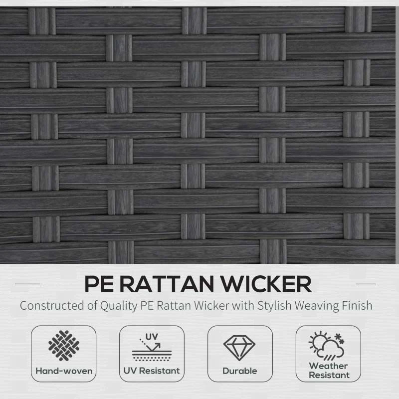 Check out this Outsunny 10-piece rattan garden sofa dining set with 3 corner sofas, 3 middle seats, a table and 3 foot stools that we can be sure will compliment your outdoor living space perfectly. The modern design mean you can tuck the sofa into a nice corner of your garden making the most out of your space. Constructed from a metal frame and covered in a PE rattan wicker, this garden sofa set is durable, strong and will last for years to come. The extra wide seats, high back and arm rests will keep you and a few friends supported and completely comfortable for hours on end. The thick cushions, each have a zip making them easy to remove to wash and maintain yourself at home. The coffee table and ideal for resting your drinks or snack bowls and is lightweight so is easily manoeuvred to your preferred position, even with the glass top finish. Sit back and relax with your feet up with the foot stools or use as additional seating to entertain a few others. If you are looking for a relaxing and modern rattan garden sofa set, complete with 4 scatter cushions, this is the one for you.