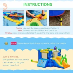 Check out this fun and quirky Outsunny bouncy castle that we can be sure will keep your kids entertained for hours on end. The fun slide and side flap makes it easy for your kids to access and exit without assistance. Complete with climbing wall and basketball hoop, all kids, big and small will have fun all day long. The kids are safe and secure in the surrounding net and will keep you at ease and relaxed, the stakes enable you to safely secure this castle to the ground. Made from an environmentally friendly and water-resistant Oxford fabric that is strong, durable and will last for years to come, in case of a puncture this castle comes will spare patches for you to maintain and repair at home. Inflate in momentβs notice with the supplied high quality electric inflater and compactly store away in the added carry bag when not in use. If you are you looking for a bright and happy place for your kids to play, look no further this bouncy castle is the one for you.