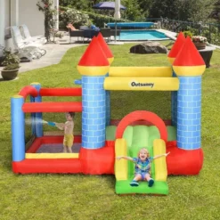 Check out this fun and quirky Outsunny bouncy castle that we can be sure will keep your kids entertained for hours on end. Let the kids jump into the added paddling pool to keep cool on warm summer days or fill with balls to create a ball pit. Your kids are safe and secure and will keep you at ease and relaxed, the 6 stakes enable you to safely secure this castle to the ground. Made from an environmentally friendly and water-resistant Oxford fabric that is strong, durable and will last for years to come, in case of a puncture this castle comes will spare patches for you to maintain and repair at home. Inflate in moment’s notice with the supplied high quality electric inflater and compactly store away in the added carry bag when not in use. If you are you looking for a bright and happy place for your kids to play, look no further this bouncy castle is the one for you.
