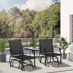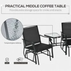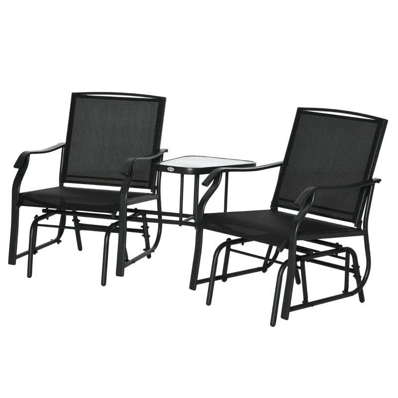 If you are looking for a modern design piece of furniture to complement your outdoor living space, this Outsunny rocking garden chair set is the one for you. Constructed from a strong metal powder coated frame, this garden bench will last for years to come. Covered in a texeline material, it will be protected from the elements by draining water and will circulate air to keep you cool on warm summer days. The gliding arms will gently rock you back and forth keeping you completely relaxed for hours on end. With a deep seat, high back and curved arm rest, this garden chair will keep you supported and comfortable all day long. Complete with a tempered glass central table perfect for you and a friend to rest your drink or book.