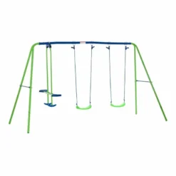 This Outsunny swing set for kids provides instant fun space for any backyard, patio, or garden. The design comes with two swing seats and a double-seat glider, which breezes back and forth smoothly, giving kids a chance to play with their friends/parents. The glider is fitted with footrests for comfort. Height-adjustable durable ropes suit users of different ages. The metal frame, made into an βAβ shape provides full support and balance.