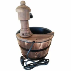 - Retro styled wood barrel fountain pump adds a unique touch to your garden and outdoor areas