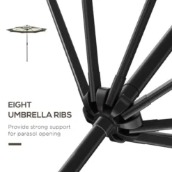 Stay protected from the sun while enjoying the outdoors with the Outsunny Outdoor Patio Umbrella. This versatile sun umbrella allows you to control the angle of shade, eliminating glare and providing a comfortable environment. Designed in two attractive colors, it complements any outdoor setting, from parks and gardens to patios and beaches. The tiltable canopy with three angle settings ensures protection from the setting sun. Crafted with a sturdy metal frame and 180gsm polyester fabric, this garden umbrella is built to last. The vented canopy and eight ribs keep it stable even in windy conditions. With a convenient crank handle, opening and closing the umbrella is easy. Assembly is required, and it comes with a two-section pole for easy transport.