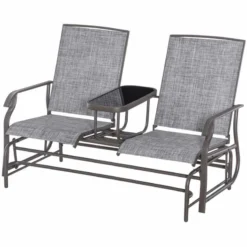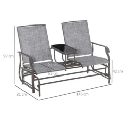 Check out this Outsunny double garden seat with centre table perfect for resting your drink or book on. Constructed from a metal frame this garden chair is durable and the powder coating protects the garden chairs from the weather elements for years to come. The seat and back rest are covered in a mesh fabric, this allows air to circulate keeping you cool on warm summer days and can be easily cleaned with a damp cloth. The deep seat, high back and curved arm rests offers you and a friend ultimate support and comfort for hours on end. The rocker bench gently glides you back and forth to keep you both totally relaxed in the comfort of your own garden. If you are looking for a modern piece of furniture to complement your garden space, look no further, this is the bench for you.
