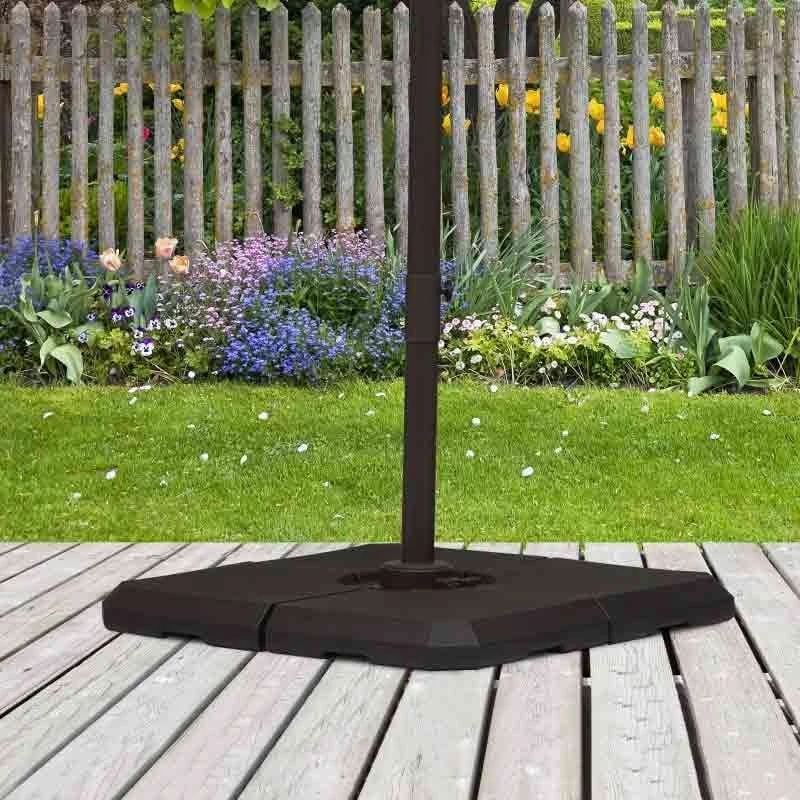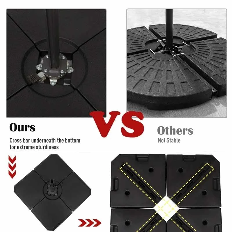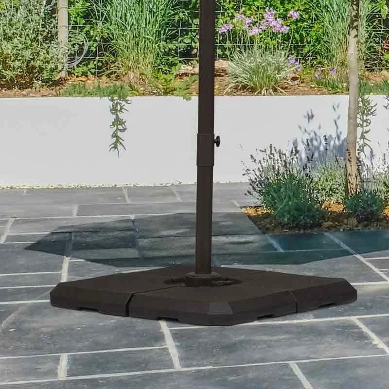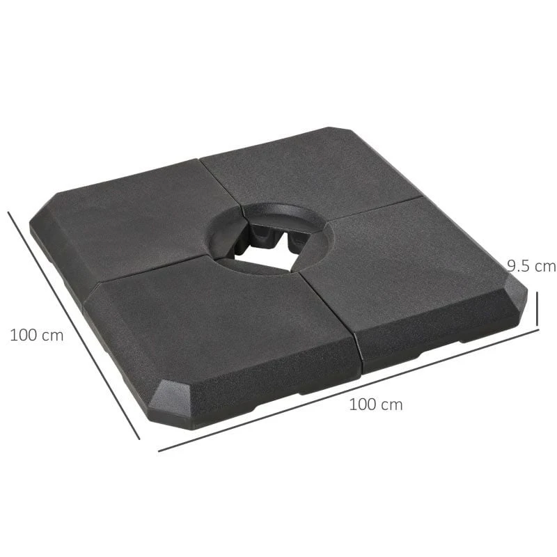This Outsunny four-part parasol base is perfect for keeping your parasol weighted and in place during the summer. Its robust shell is durable and resistant to weather and UV damage, and each component has filling caps for water or sand. The cross base is not included, but it features a center bar for mounting the parasol pole. The sturdy plastic body is resistant to weather and UV fading, and it is compatible with cantilevers and Roma parasols. The smooth surface is easy to clean and suitable for banana and Roman umbrellas.